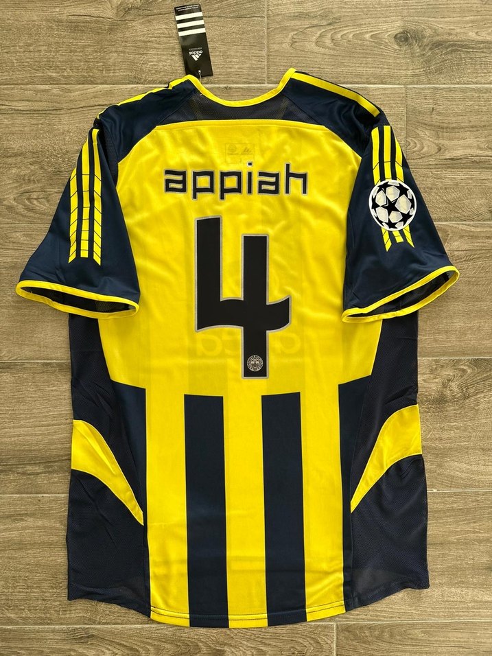 Fenerbahçe 2005-2006 İç saha APPİAH forması.Sıfır ve etiketlidir. Fenerbahçe tarihinde iz bırakmış oyuncuların giydiği harika bir formadır. Alex, Anelka, Appiah, Tuncay gibi süper yıldızların terlettiği formadır. Ürünün kolunda kabartmalı Şampiyonlar ligi Patch mevcuttur. Sıfır poşetlidir. Kusursuz kondisyondadır. S-M-L-XL-XXL Bedenleri mevcuttur.