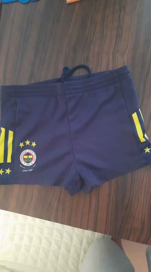Koyu mavi renkli, yanlarında sarı yıldız çizgili ve baskılı Fenerbahçe logosu bulunan erkek çocuk mayo şortu. Rahat bel bantlı ve kısa paçalı.
