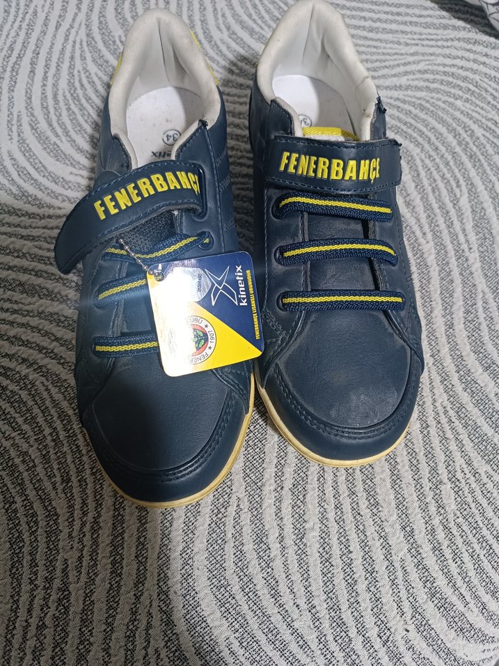 Mavi ve gri renklerde, Fenerbahçe baskılı, lastik tabanlı ve cırt cırtlı erkek çocuk spor ayakkabısı. Trend sokak stili için uygun.