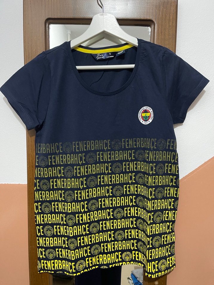 Fenerbahçe logosu ve baskılı yazılarla süslenmiş, kısa kollu ve yuvarlak yakalı, rahat kesim kadın tişörtü. Sentetik kumaştan, günlük kullanıma uygun.