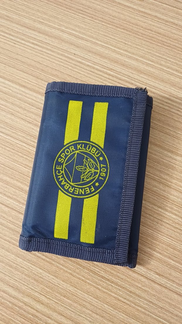 Fenerbahçe logosu ve sarı şeritlerle süslenmiş koyu mavi erkek cüzdan. Modest ve spor tarzda, athleisure stiline uygun bir tasarım.