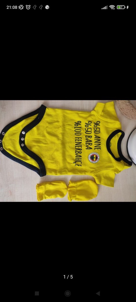Kısa kollu, sarı renkli Fenerbahçe baskılı bebek body. Yuvarlak yaka, çıtçıtlı ve yumuşak sıcak kumaştan. Elde eşleşen eldivenler bulunur.