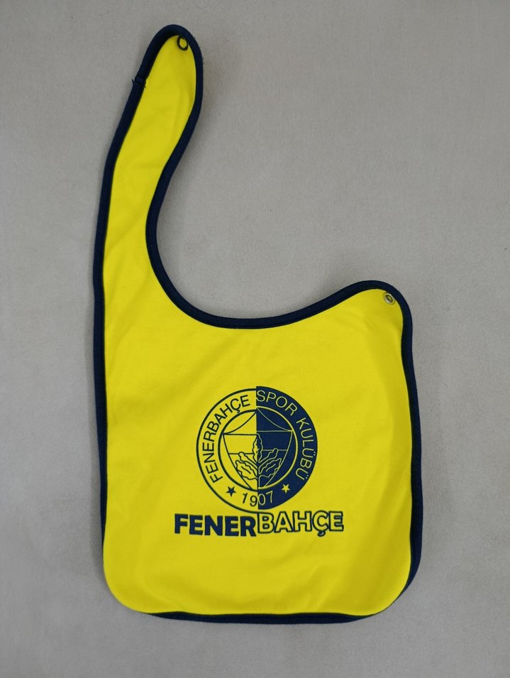 Sarı renkli, renkli Fenerbahçe logosu ve yazısı baskılı bebek önlüğü. Koyu renk kenarlığı ve kolay kullanımlı çıtçıt kapaması vardır. orjinaldir. güncel fiyatları 430 tl den başliyor.