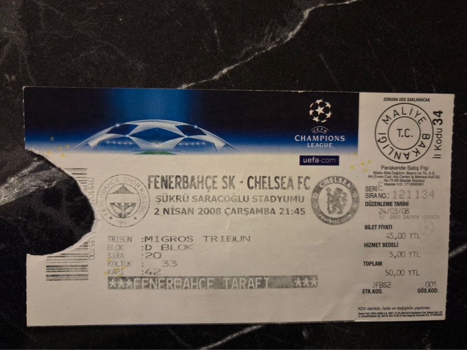 2 Nisan 2008 günü Fenerbahçe’nin Chelsea ile oynadığı Şampiyonlar Ligi Çeyrek Finali ilk maçının efsanevi kale arkası hatıra bileti. Orijinal. Koleksiyonluk. Nadir.