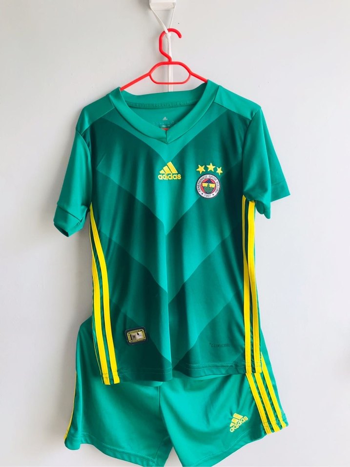 Yeşil Adidas Fenerbahçe forması ve şortu, baskılı ve drapeli detaylarla renkli ve sportif sokak tarzı sunar.