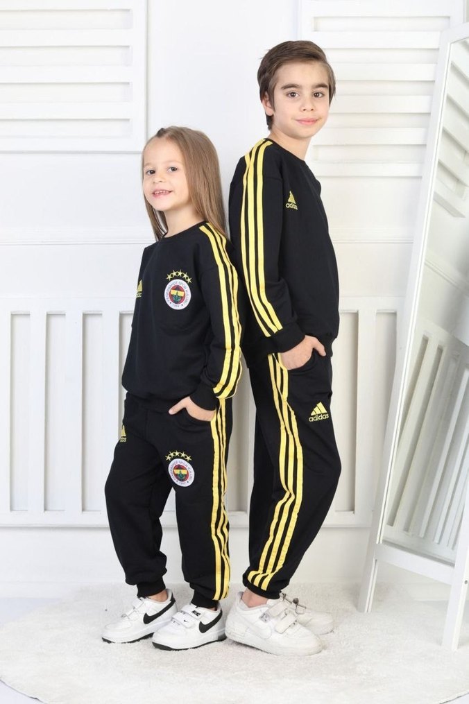 Fenerbahçe Erkek çocuklar için siyah eşofman takımı, sarı şeritler ve baskılı logolarla. Rahat loose fit, bisiklet yaka detaylı, yumuşak ve sıcak kumaştan üretilmiştir.