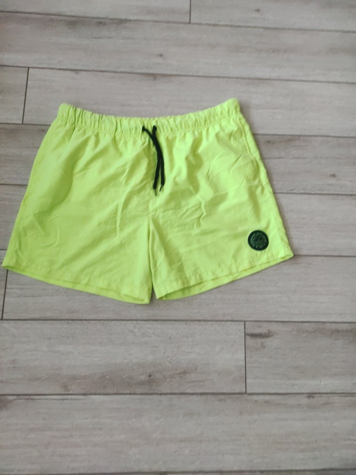 Bol kesim, lastikli bel ve düğmeli detaylı sarı erkek deniz şortu. Plaj için trend, rahat bir tarz sunar.