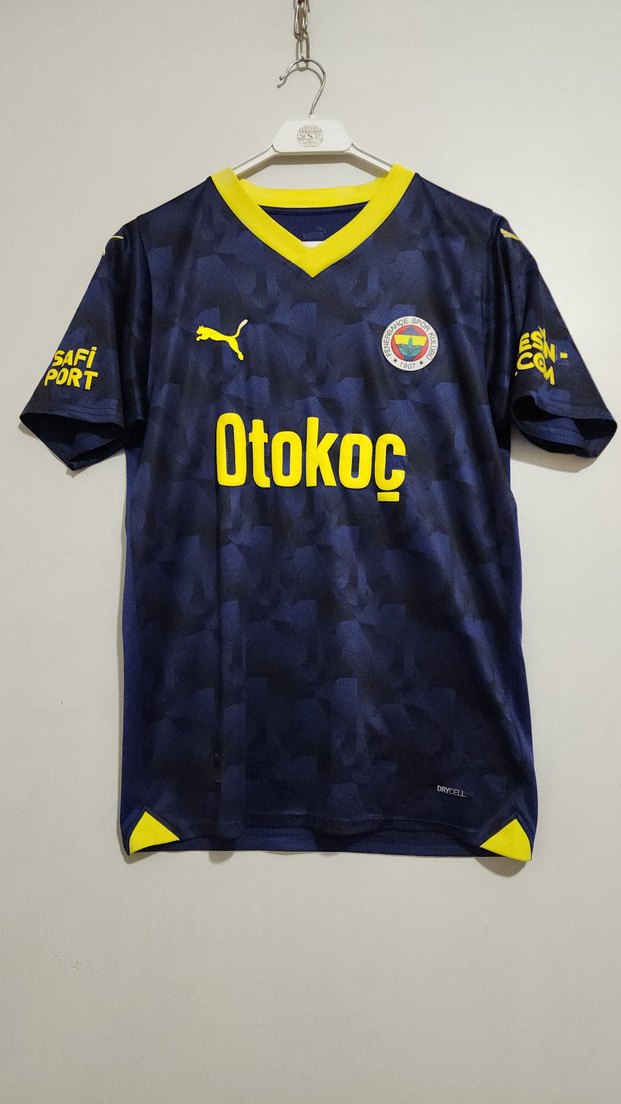 Koyu lacivert, kısa kollu, yuvarlak yakalı ve bol kesim Fenerbahçe spor forması. Sarı detaylar ve Otokoç baskılı sponsor logoları içerir. Spor ve günlük kullanım için uygundur.