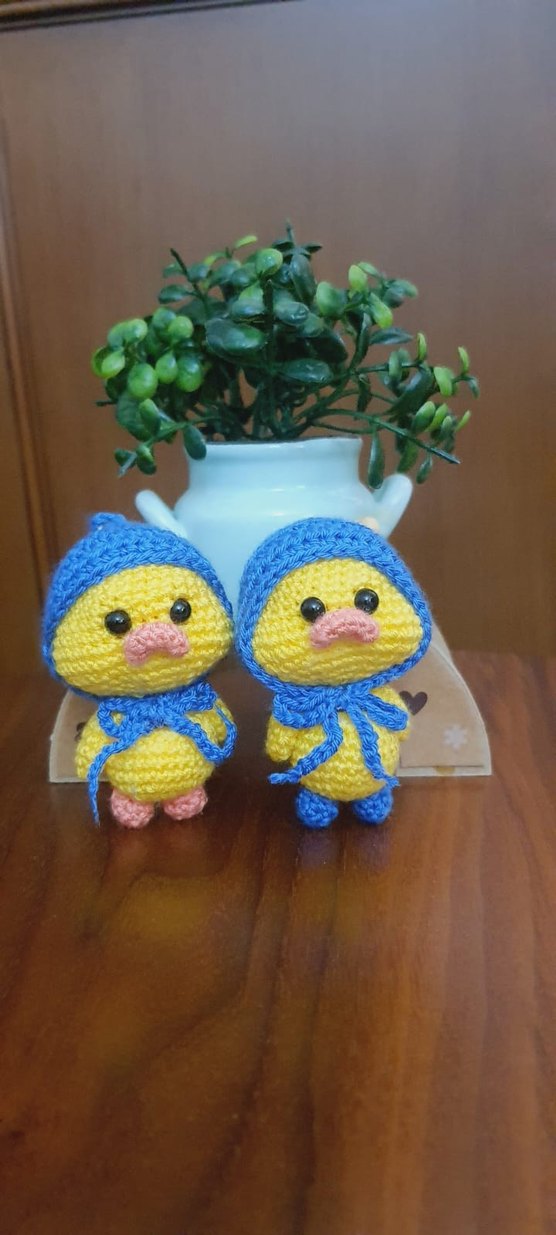 Mavi örgü şapka ve atkı takan sarı peluş ördek oyuncaklar. Yumuşak ve el yapımı, sevimli dekoratif anahtarlık ürünler olarak kullanılabilir. Adet fiyatıdır