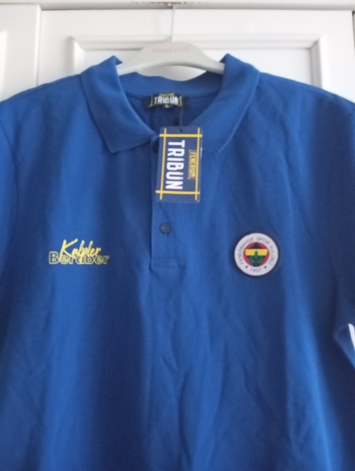 Mavi, düğmeli ve baskılı detaylara sahip, yakalı ve kısa kollu, bol kesim erkek polo tişört. Spor ve günlük kullanıma uygun.