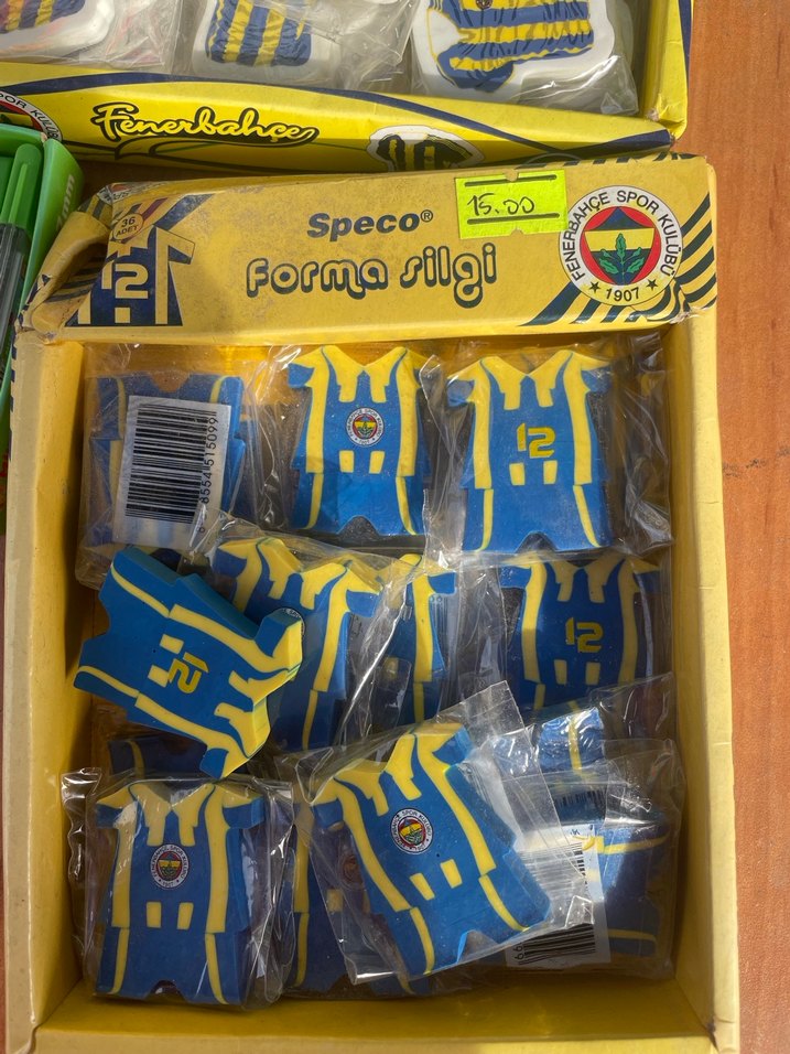 Plastikten yapılmış, Velcro özellikli, renkli Fenerbahçe forması şeklinde silgi seti. Takım renkleri ve logosu bulunur. Lisanslı silgi adet fiyatı 15₺dir en az 5 adet alınmaktadır