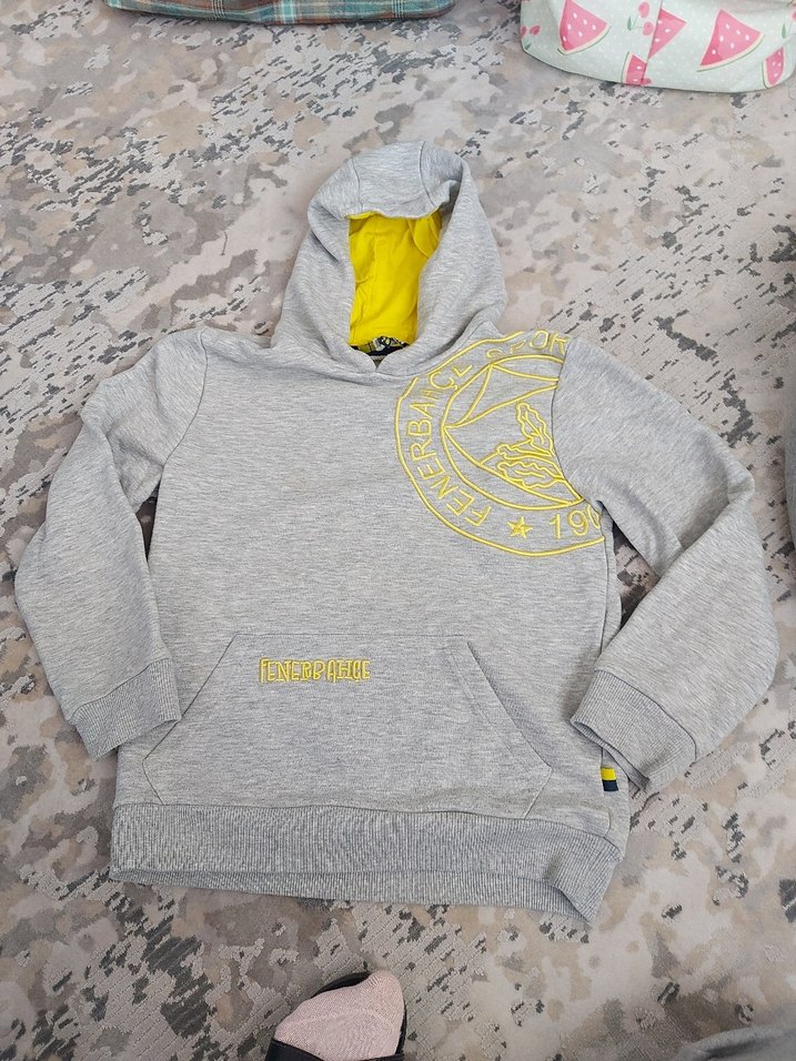 Gri renkli, kapüşonlu ve uzun kollu erkek sweatshirtü, baskılı ve örme dokuludur. Rahat kesimli ve kapüşon içi sarı renktedir. hic giyilmedi
