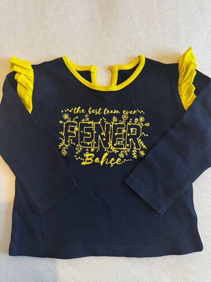 Kız çocuk uzun kollu tişört, yuvarlak yaka ve kollarda fırfır detaylarıyla. Yumuşak ve sıcak kumaştan, pamuklu, renkli "FENER" baskılı tasarım. 1-2 kez kullanıldı.
