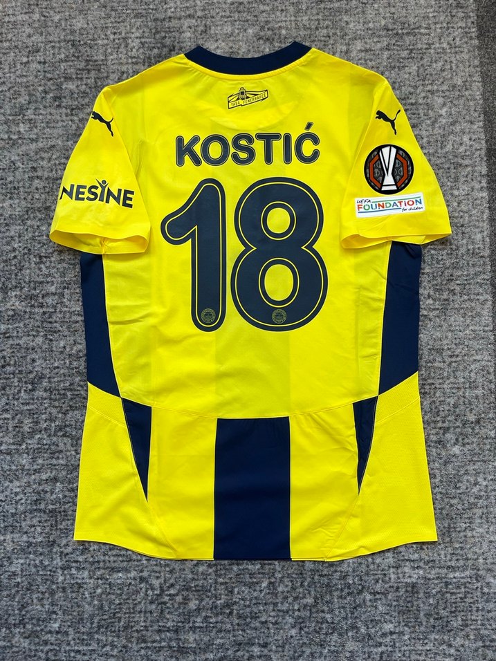 Sarı renkli, kısa kollu, yuvarlak yakalı erkek spor forması. Bol kesim ve baskılı detaylara sahip, düğmeli özellikler içerir. Canlı renklerle athleisure tarzına uygundur. 18 numara ve KOSTIC yazısı ile NESINE markalı.