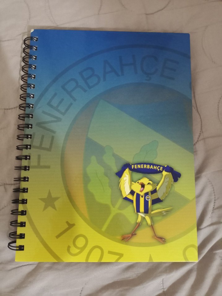 Fenerbahçe lisanslı, parlak sarı kapaklı defter. Kulüp maskotu ve spiralli ciltleme bulunmaktadır. Bir kaç sayfa eksik sadece