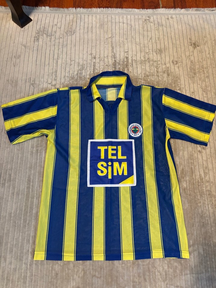 Fenerbahçe Sıfır sorunsuz Orjinal vintage nostalji forma Sarı lacivert çizgili, kısa kollu, yuvarlak yakalı erkek spor tişörtü. Velcro özellikli 'TEL SiM' baskılı detay içerir.