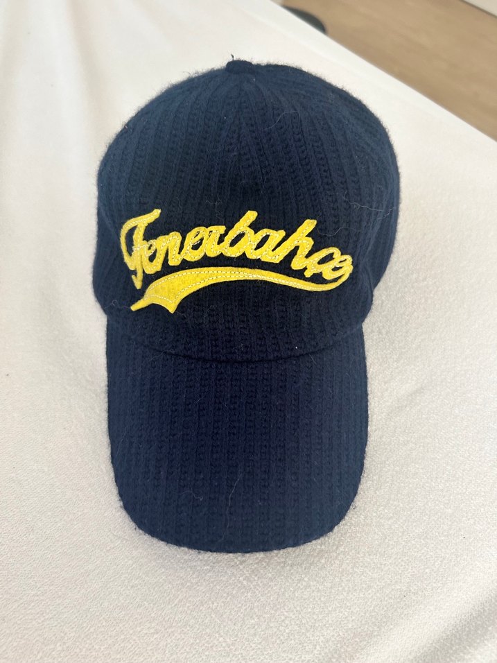 Sarı nakışlı yazı detaylı koyu renk örgü şapka. Rahat ve trend sokak stili için uygun.