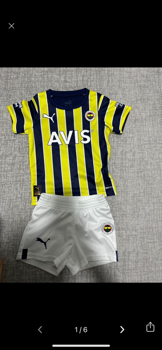 1-2 yaş orjinal Kısa kollu, sarı lacivert dikey çizgili erkek forma, V yaka ve baskılı AVIS logosu ile. Puma logolu beyaz şortlu, cırt cırt detaylı.