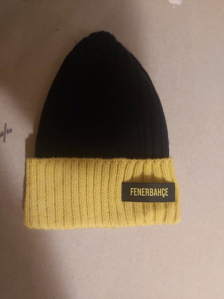 Sarı ve siyah renklerde, yumuşak ve sıcak his veren örme kadın bere. Manşette Fenerbahçe etiketi bulunur. Rahat sokak stili için uygun.