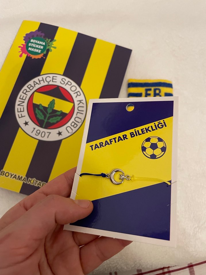 Fenerbahçe renklerinde taraftar bilekliği ve kulüp amblemli boyama kitabı içeren set. Futbolseverler için uygun. ⚽
