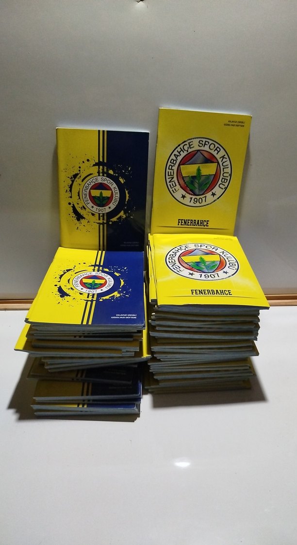 Fenerbahçe logosu bulunan sarı ve mavi kapaklı ilkokul defterleri.