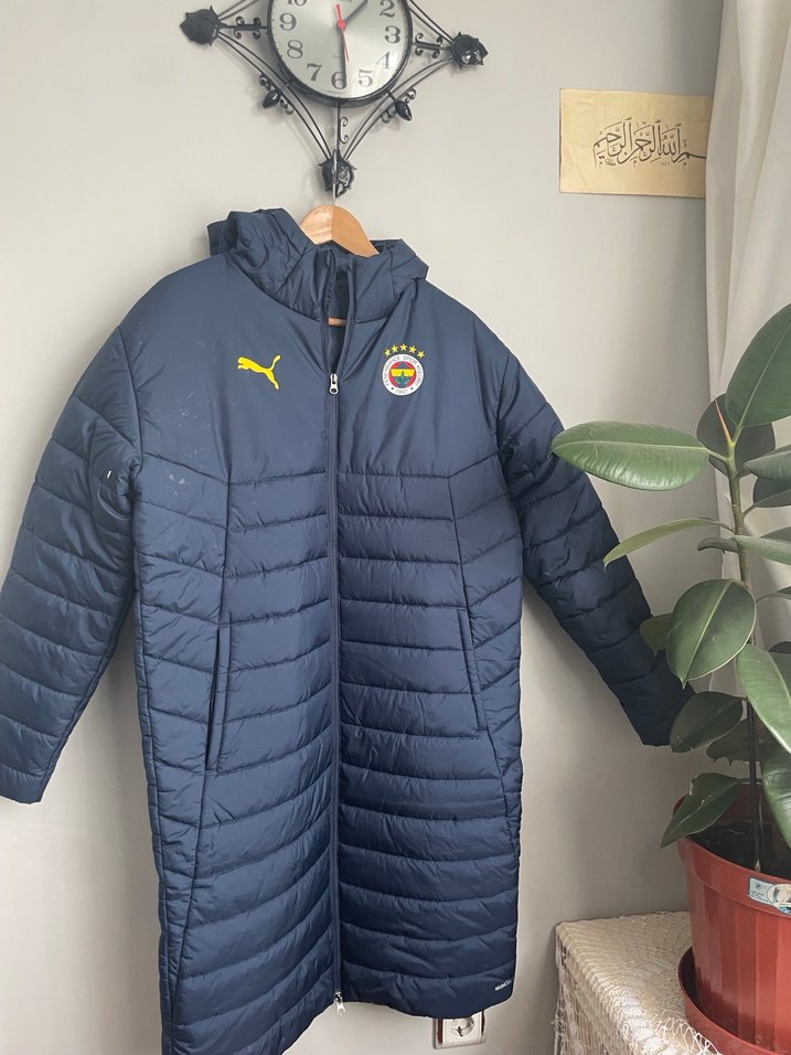Fenerbahçe logolu, fermuarlı, kapitone uzun mont. Kapüşonlu ve dar kesim, spor tarzda sıcak tutar. Elimde S beden kalmıştır. Tek sorun fermuarıdır.