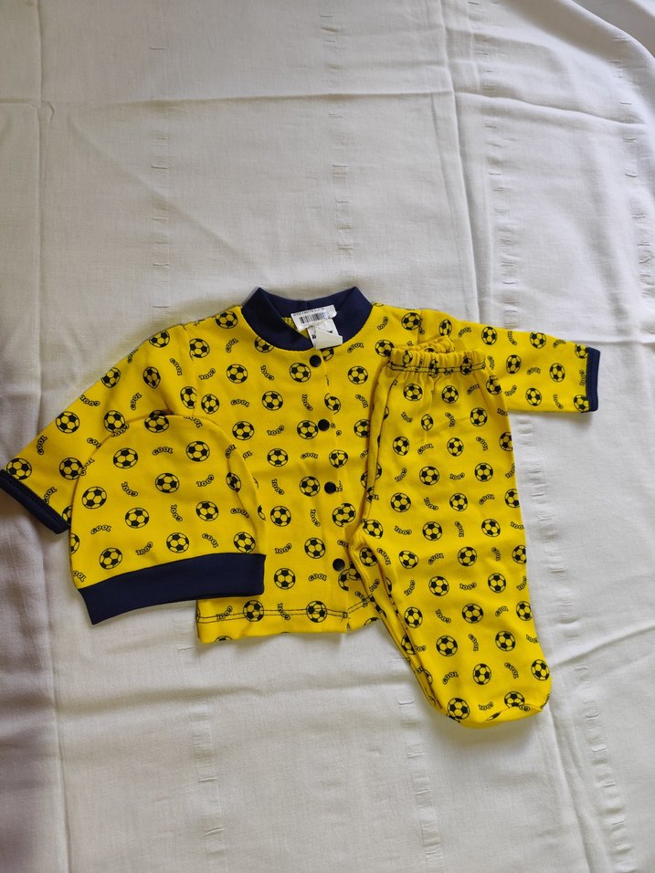 Sıfır pamuklu bebek alt üst şapka ve alt açma minderi set Renkli sarı bebek takımı, yumuşak ve sıcak kumaş, uzun kollu, bisiklet yaka ve düğmeli detaylara sahip. Futbol topu desenli, rahat tarzda. ⚽