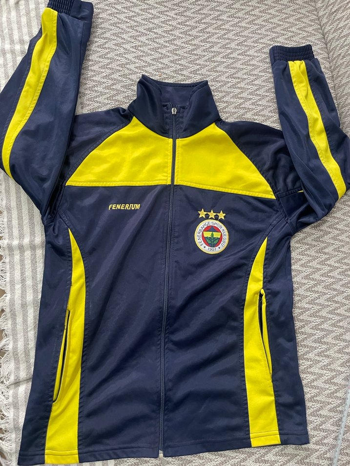 Fenerium logosu ve baskılı detaylarıyla, fermuarlı ve uzun kollu dar kesim erkek spor sweatshirtü, parlak sarı ve lacivert renklerde.