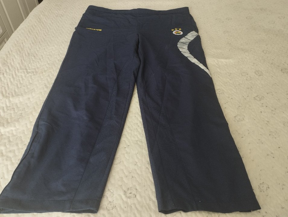Düğmeli, parlak lacivert renkte, denim kumaştan yapılmış slim fit erkek spor pantolonu. Athleisure ve sokak modasına uygun. orjinal fenerium esofmanidir.♂️