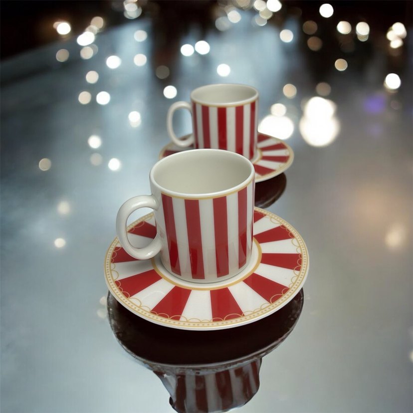 Kırmızı ve beyaz çizgili desenli porselen fincan ve tabak seti. 2 adet fincan ve 2 adet tabağı.