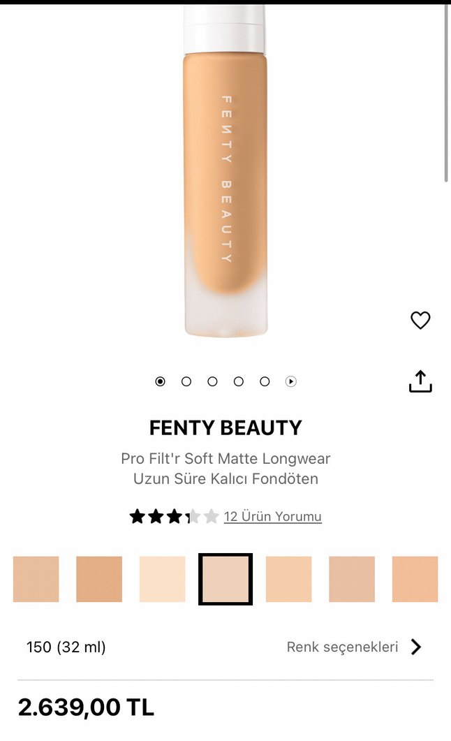 Fenty Beauty'nin açık bej tonunda, doğal görünümlü fondöteni. Şık ambalajı ve kolay uygulanabilir yapısı ile kusursuz bir cilt sağlar. Profiltr fondoten yağlı ciltler için uygun. Yarısı dolu