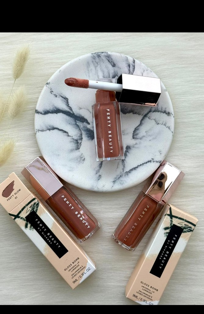 Fenty Beauty markasına ait koyu bej tonunda parlak ve pürüzsüz dudak parlatıcısı.