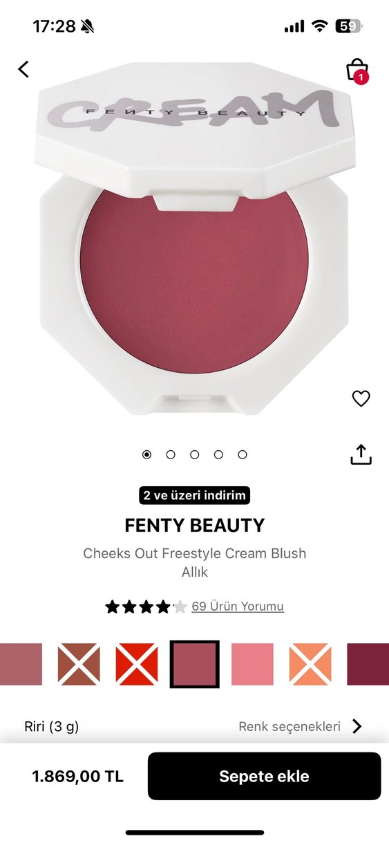 Fenty Beauty Cheeks Out Freestyle krem allık, pastel pembe tonunda, pürüzsüz ve kolay karışan yapısıyla doğal bir renk sağlar. Elimde fazla allık olduğu için satıyorum.Birkaç defa kullandım.