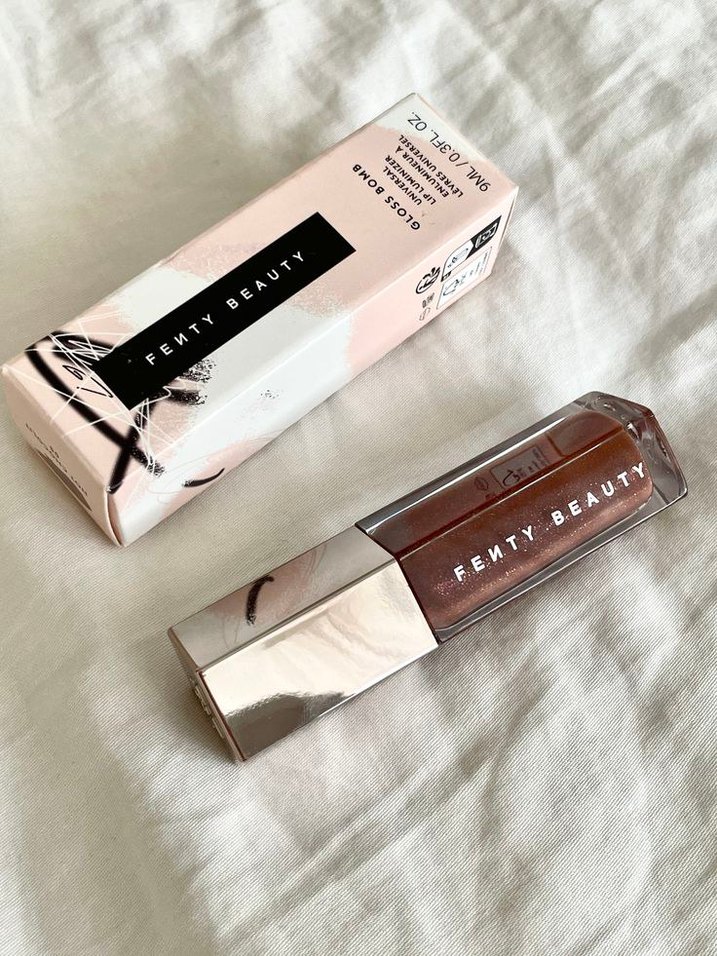 Fenty Beauty markasına ait parlak bej renkli dudak parlatıcısı, şık gümüş kapaklı ve orijinal kutusunda.