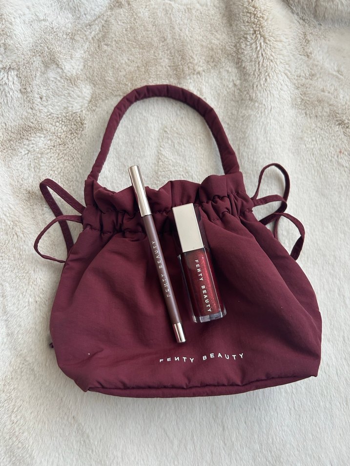 Fenty Beauty markasına ait bordo renk dudak parlatıcısı ve kalem seti, şık ve derin dudak görünümü sağlar. Taşıma için uyumlu bir çanta ile birlikte gelir.