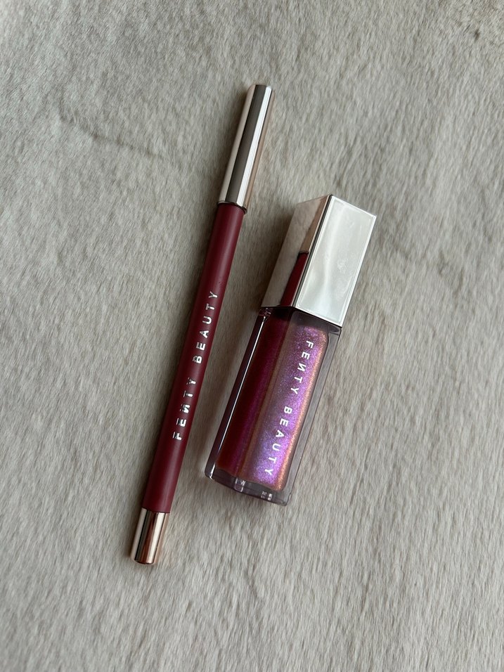 Fenty Beauty'den parlak bordo renkli ruj ve uyumlu dudak kalemi seti, canlı bir görünüm sağlar.