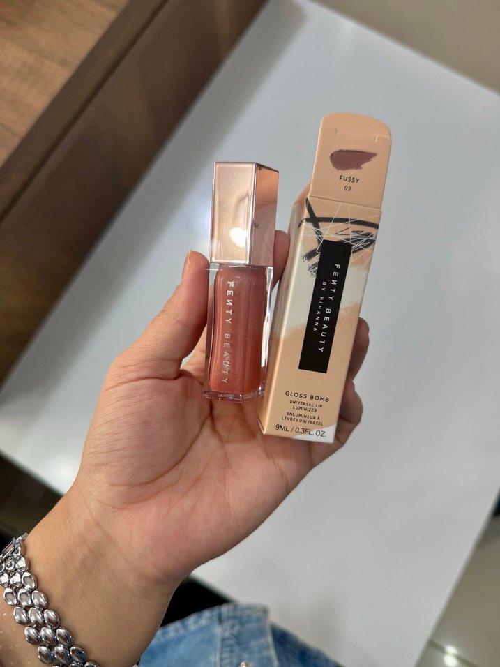 Fenty Beauty'nin açık bej tonunda dudak parlatıcısı, parlak ve pürüzsüz bir görünüm sunar. Rose altın renkli şık ambalajda.