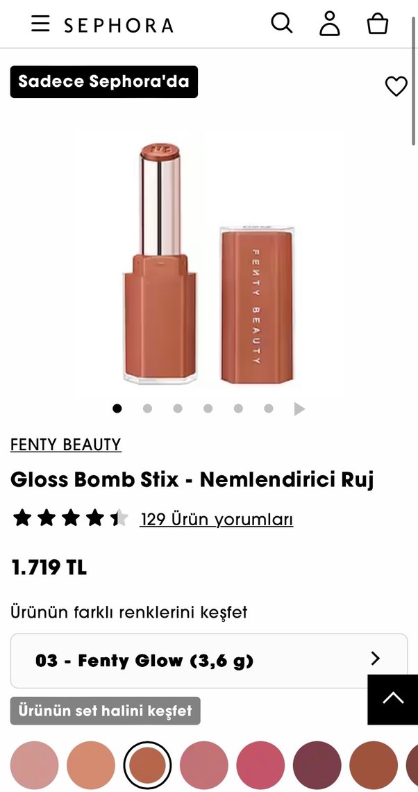 Fenty Beauty Gloss Bomb Stix, 3,6 g, parlak bej renkte nemlendirici rujdur. Canlı ve nemlendirici etkisiyle öne çıkar.