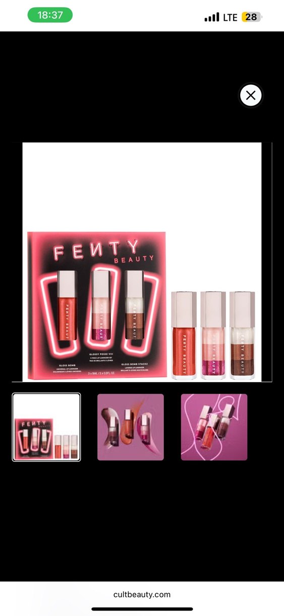 Almanya sephoradan kasım 2025te alındı. 2 adet mevcut. orijinal ve sıfır. Kargosu 24 kasımdan sonra olacaktır. 3 tam boy ürün içeriyor. Fenty Beauty Gloss Bomb Stackz, Sugar Plumz (9ml) Fenty Beauty Gloss Bomb Stackz, Spiked Hot Chocolit (9ml) Fenty Beauty Gloss Bomb Universal Lip Luminizer, Fenty Glow Fantasy (9ml)