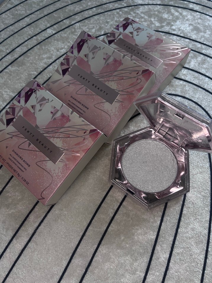 Fenty Beauty'nin ışıltılı bitişli aydınlatıcısı. Yansıtıcı altıgen kompakt kutuda. Cilde parlaklık katmak için uygun. ✨