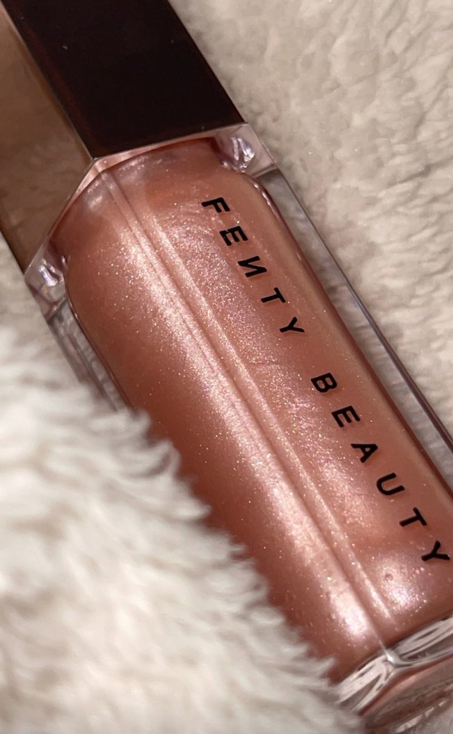 Fenty Beauty markasına ait parlak bej renkli dudak parlatıcısı, hafif ışıltılı ve parlak bir görünüm sağlar.