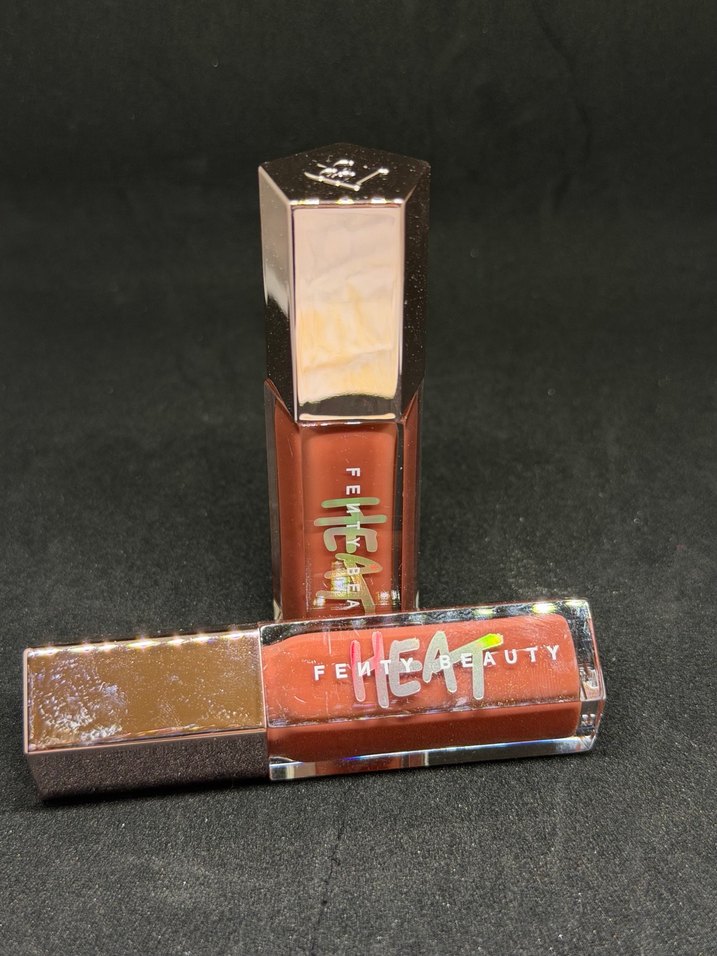 Fenty Beauty markalı parlak bej renkli, 'HEAT' yazılı canlı bitişli lip gloss. Renk için sorunu