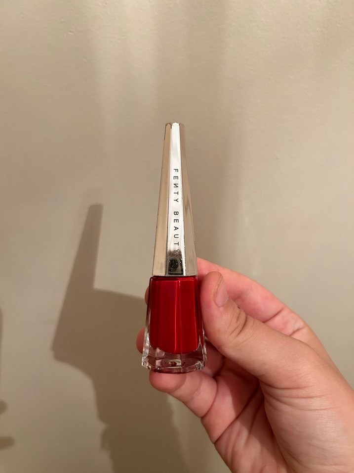 Fenty Beauty'nin parlak kırmızı renkli dudak parlatıcısı, şık gümüş kapak tasarımıyla canlı bir parlaklık sunar.