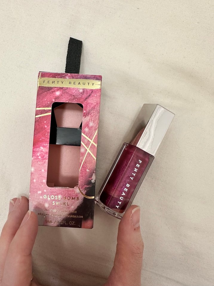 Fenty Beauty markasına ait parlak pembe renkli dudak parlatıcısı, canlı ve parlak bir görünüm sağlar. Birkaç kez denendi.