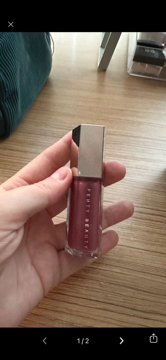 Fenty Beauty'nin parlak bordo renkli dudak parlatıcısı, şık gümüş kapaklı. Canlı parlaklık sağlar. 1-2 kere denendi.