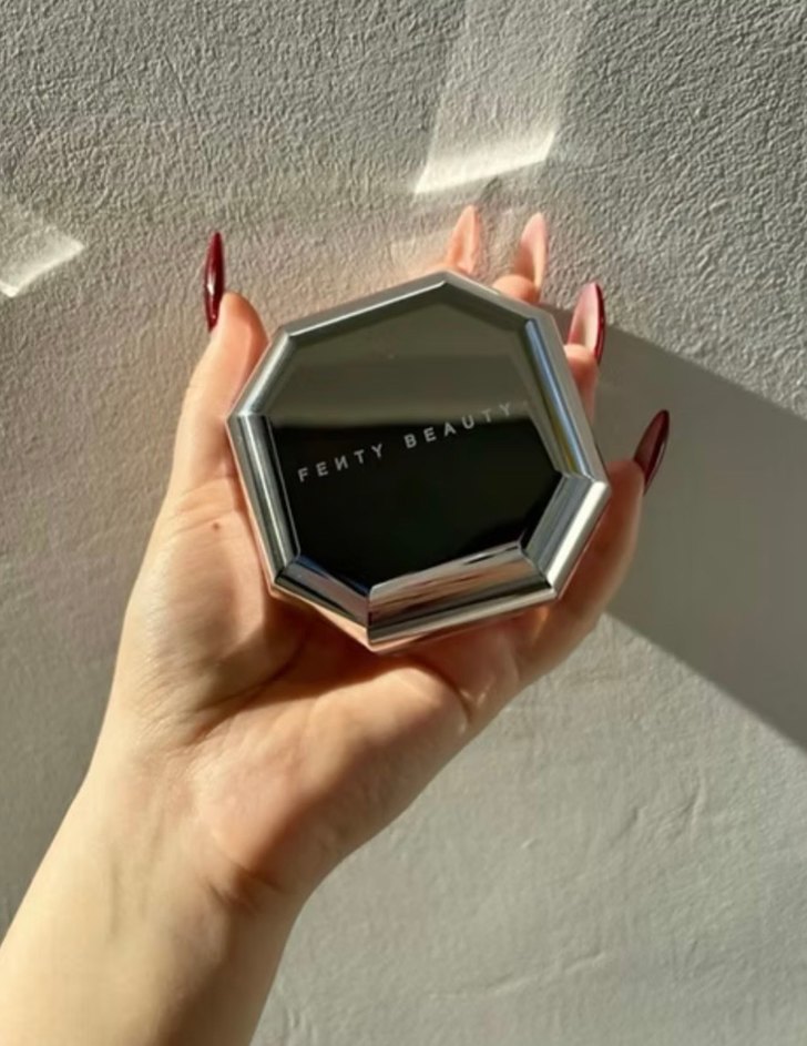 Fenty Beauty'nin koyu bej rengindeki pudrası, şık metalik sekizgen kutusunda. Pürüzsüz ve eşit kapatıcılık sağlar.