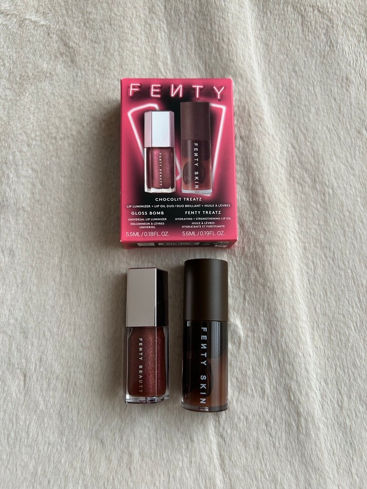 Fenty Skin'in bordo renkli parlaklık ve dudak yağı seti, canlı parlaklık ve nem sağlıyor. Şık ambalajıyla dikkat çekiyor.
