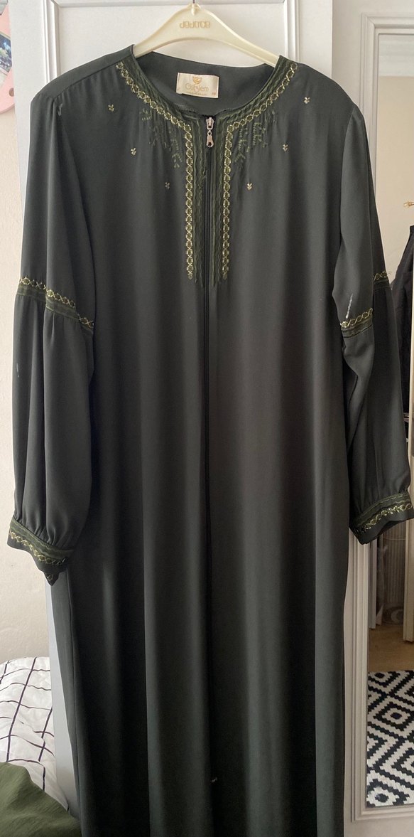 Bu haki uzun elbise, uzun kollu ve yüksek yakalıdır. Nakış detayları ve fermuarı vardır. Rahat kesimi ve sentetik kumaşı ile günlük kullanıma uygundur.