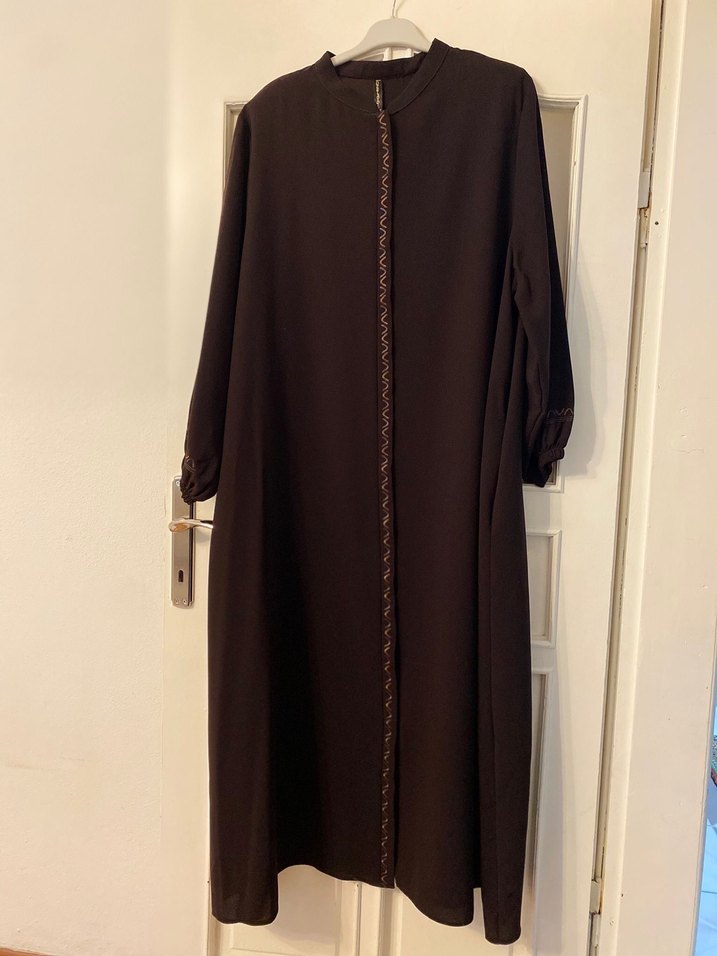 Uzun, bol kesim kahverengi elbise, yüksek yakalı ve uzun kolludur. İpeksi kumaştan yapılmış, dökümlü tasarıma sahiptir. Minimalist gotik stil için uygundur, ofis kullanımı için sade ve desensizdir.