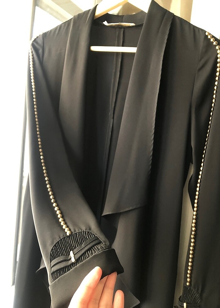 Setrems marka yazlık ince kırışmayan ferace. Kol detayı ince işçilikle yapılmış kol boyunda demir raptiye şekilde sıra halinde boncuklar var. Yakası dökümlü. Kemerinde de koldaki detaydan var. Özel günlerinizde kullanabilirsiniz. Çok giyilmediği için sapasağlam,sıfır ürün gibi. 1 beden yani 38-40 beden aralığında ama 38 bedenler için daha uygun.